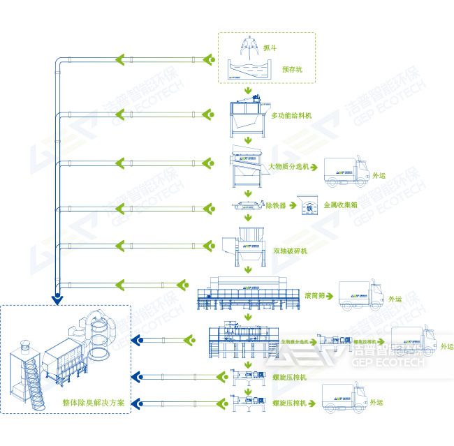 果蔬垃圾被放入螺旋输送机中,在连续均匀地向双轴撕碎机输送物料的同时,分离固水、排出污泥,经双轴撕碎机破碎后的物料进入螺旋压榨机脱水处置,最后被送入料仓。 (此工艺仅供参考,具体工艺需根据项目情况定制)