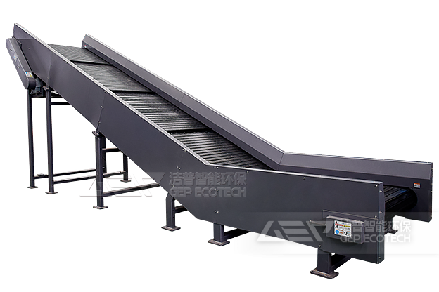 由动力装置、传动轴、滚筒、张紧装置、链轮、链条、轴承和重型链板共同构成的金属链板输送机,是快速运送大体积、大重量固体废物(如废旧沙发、旧冰箱、树根、玉米秸秆等)的理想设备。无缝链板,进料顺畅、不卡料、输送量大;挡板设计,有效防止物料的滚落,保证较高的进料效率。