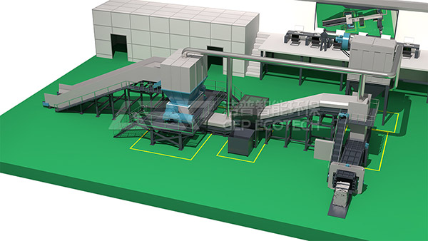 洁普智能大件垃圾处置生产线主要采取“破碎+分选+压缩减容”的工艺,将大件垃圾经过破碎减容分选,转变成可再利用的资源。该生产线由传送系统、破碎系统、磁选系统、智能监测系统和智能降尘系统构成,使大件垃圾变废为宝,提高回收利用率,真正实现大件垃圾减量化、资源化和无害化处置。