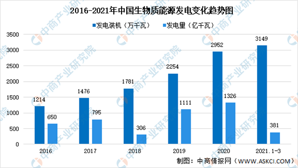 数据显示,2020年,全国生物质发电新增装机543万千瓦,累计装机达到2952万千瓦,同比增长22.6%;2020年生物质发电量1326亿千瓦时,同比增长19.4%;2021年第一季度,生物质发电装机3148.5万千瓦,生物质发电380.8亿千瓦时。