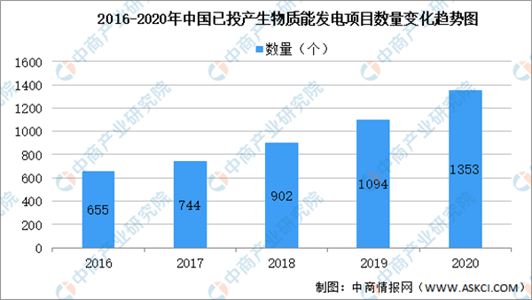 随着我国对生物质能发电越来越重视,我国生物质发电相关项目量也在不断增多。数据显示,我国已投产生物质能发电项目由2016年655个增至2020年1353个,年均复合增长率为19.9%。