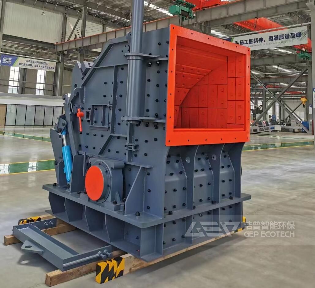 反击式破碎机是建筑垃圾处置中最重要的设备之一,是应用冲击力破碎物料的设备。物料进入破碎机后,受到高速回转的击锤的冲击,物料即沿着节理面或接界面破裂。被冲击后的物料获得巨大的动量,并以高速抛向碎料板,经碎料板的反击,物料再次被击碎,从碎料板返回的物料,又遭击锤的重新撞击,进一步破碎。当物料在击锤和碎料板之间往返时,除了击锤及碎料板的冲击外,物料间亦发生相互撞击。上述过程不断进行,直到破碎后的物料小于击锤及碎料板之间的间隙时,才从破碎机下部排出。