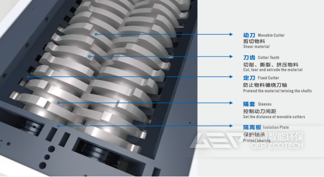 双轴剪切式撕碎机的破碎原理是在两个刀轴上都装有交错的刀片,两个刀轴在相向旋转的过程中通过刀刃的剪切、以及刀齿的撕裂来实现破碎。主剪切方式为相邻动刀刀刃口的剪切作用,副剪切方式为动刀刀齿的撕裂作用。